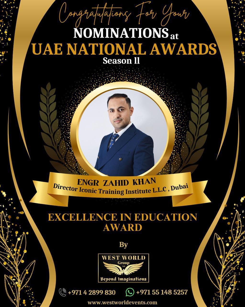 Engr. Zahid Khan, Director of Iconic Training Institute, is nominated for the Excellence in Education Award 2025 at the UAE National Award, recognising his impact on education and student empowerment.